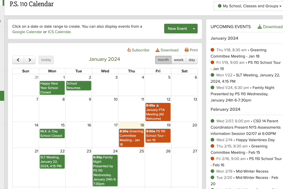 ParentSquare has a calendar that will show events from your groups as well that you can add to your personal calendar. From Home, click “view all” events on the right side and then the ”Subscribe” link on the calendar page.